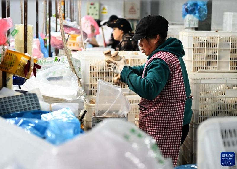 近年来,江苏省盐城市大丰区大力发展食用菌产业,培育壮大龙头企业,强化精深加工,实现工业化、标准化生产,有效带动村民就业增收。图为12月21日,在盐城市大丰区久禾生物科技发展有限公司,工人在包装杏鲍菇。新华社记者 季春鹏 摄