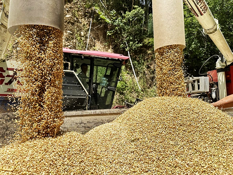 在陕西凤县坪坎镇倒贴金村集体经济的田野里,脱粒后的麦粒源源不断地从收割机中倾泻而出。