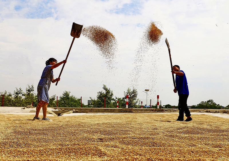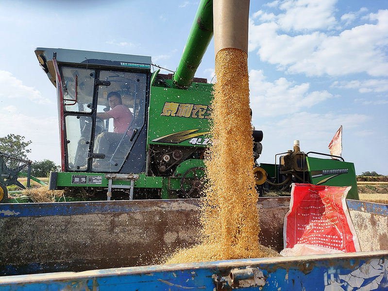 5月29日,陕西省三原县大程镇永合村村民将收割的麦粒从卸粮筒倾泻到车厢,准备晾晒。