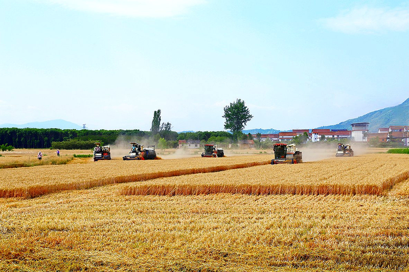 6月11日,陕西省洛南县三要镇永坪村高标准试验田基地里,收割机在麦 浪中来回穿梭,切割、脱粒、装车……一派繁忙的夏收景象。