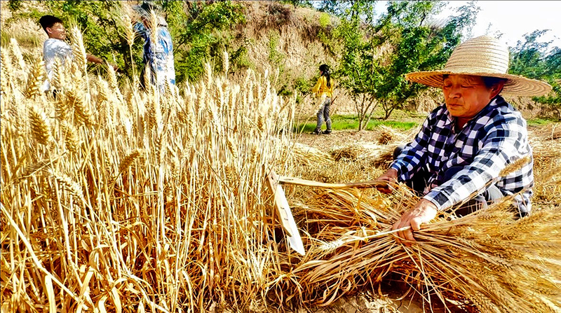 在陕西富平曹村镇白庙乡大王村,村民正在人工割麦。