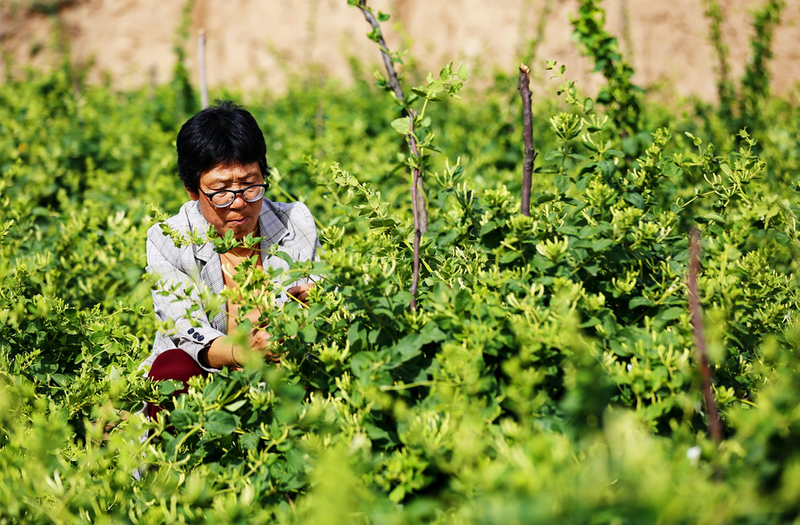 近日,金银花陆续迎来采摘季。在山西省临汾市襄汾县陶寺乡李庄村,农民们正忙着采收金银花,田间地头一派农忙景象。