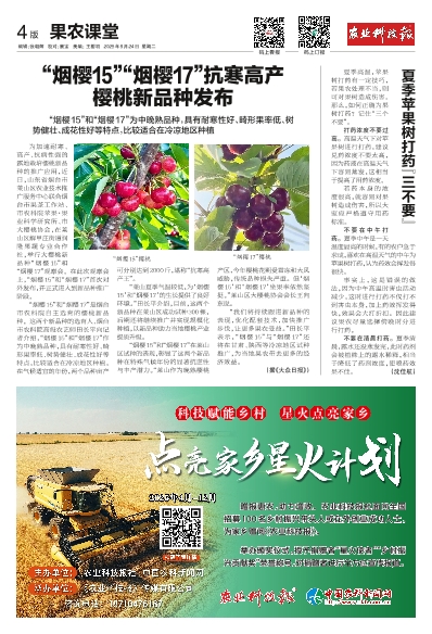 “我们将持续跟进新品种的表现,优化配套技术,加快推广步伐,让更多果农受益。”田长平表示,“烟樱15”与“烟樱17”还将在甘肃、陕西等冷凉地区试种推广,为当地果农带去更多的经济效益。