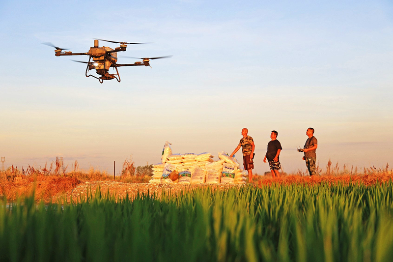 8月24日,位于安徽省宿松县的安徽农垦华阳河农场内,工作人员将配方肥送到田头,同步用无人机开展水稻施肥作业。