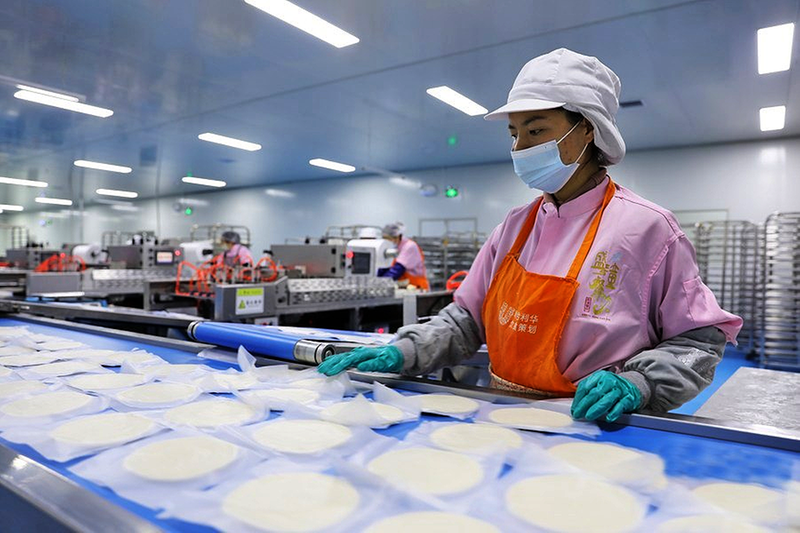 工人在生产线上制作肉夹馍饼胚。 农业科技报·中国农科新闻网记者 陈小文