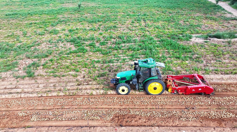 在神木市锦界镇瑶镇村广袤田野上,一台台马铃薯收获机来回穿梭,一袋袋刚出土的“金疙瘩”整齐码在田间地头,映衬着种植户喜悦的笑脸。