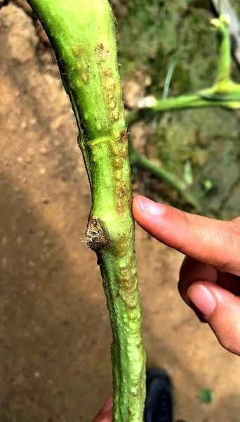 摘叶要参照植株长势、种植密度决定,主要是为了保证田间结构、通风透光良好。近年来,番茄茎秆部病害高发,所以在给番茄整枝打杈时,植株上最好没有露水,可以选择噻唑锌、氯溴异氰尿酸、中生菌素等喷雾,重点预防细菌性病害。需要注意的是,现在有的大棚面积大,不少种植户给番茄整枝打杈需要几天的时间,不要等到全棚干完后再喷洒药剂,最好当天整枝打杈的植株,当天就要喷洒药剂,不给病原菌留下从伤口处侵染的机会。