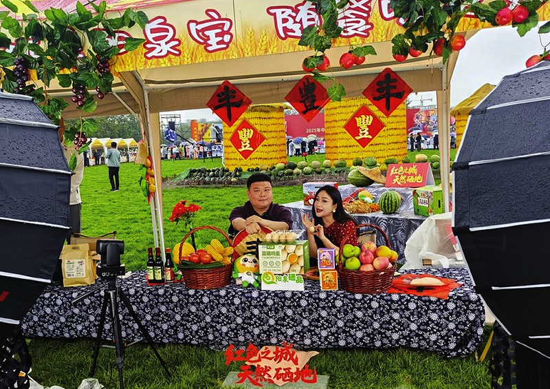 ◀9月 16日,2025年中国农民丰收节山西主场活动在阳泉市盂县秀水镇北关村启幕。图为主播正在通过直播售卖富硒农产品。高桦尚晨 摄