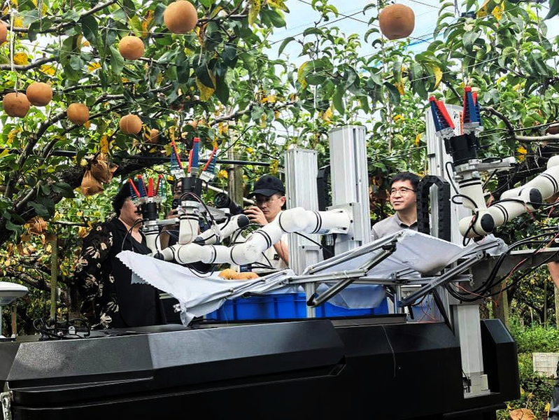 在现场观摩会上,一款由南京农机化所联合苏州极目机器人科技有限公司、南京农业大学国家信息农业工程技术中心、东南大学共同研制的全天候多臂协同“采—收—运”一体式果园采摘机器人成为焦点。该机器人针对梨子智能采收开展了示范应用与推广,获得了与会专家及现场观摩农户的好评。大家一致认为,果园智能采摘机器人具备完全替代人工采摘作业的能力,有望解决我国水果产业面临的劳动力不足、生产成本高以及生产效率低等难题。