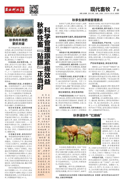秋季是牲畜养殖的关键期,既要抓育肥提效益,也要防病害减损失。本期围绕肉羊、生猪育肥及牛“红眼病”防控展开,为养殖户提供实用指引:肉羊育肥明确组群、日粮搭配等关键环节,生猪“贴秋膘”聚焦环境调控与防疫,还针对秋季高发的牛“红眼病”,详解中西医治疗方案。这些内容贴合秋季养殖需求,助力养殖户科学管理,实现收益提升与疫病防控双向保障。