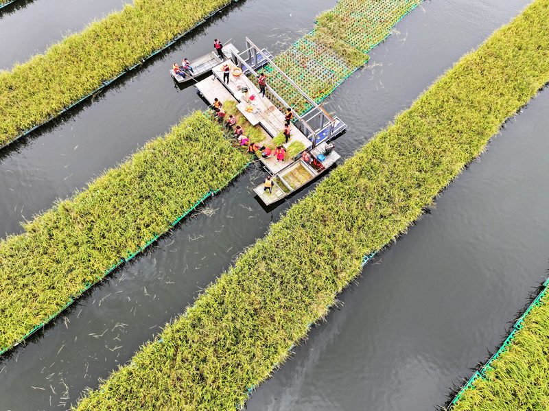 10月14日,工人在安徽省淮南市凤台县顾桥镇采煤沉陷区的水面上收获漂浮式水稻。