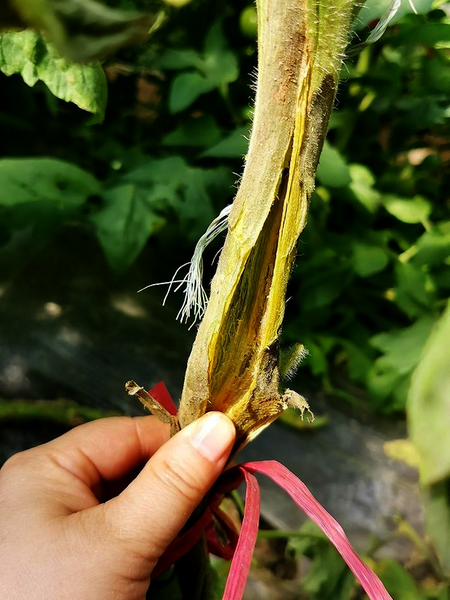 髓部坏死为细菌性病害。发病初期嫩叶褪绿,严重时上部植株褪绿萎蔫,下部茎坏死,病茎表面生褐色至黑褐色斑、外部变硬,纵剖可见髓部变黑或坏死,维管束变褐。髓部病变处会长不定根,湿度大时轻压病部,菌脓从茎伤口和不定根溢出。