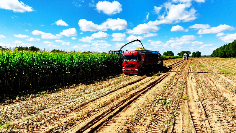 同时,在距离该地不到10公里的奶牛场里,工人们也正在紧锣密鼓地进行“收贮”作业。一车车满载青贮饲料的运输卡车陆续将青贮饲料倾倒在固定场地后,进行压实、晾晒、发酵等操作,历时45天左右,便可成为优质的“过冬口粮”。