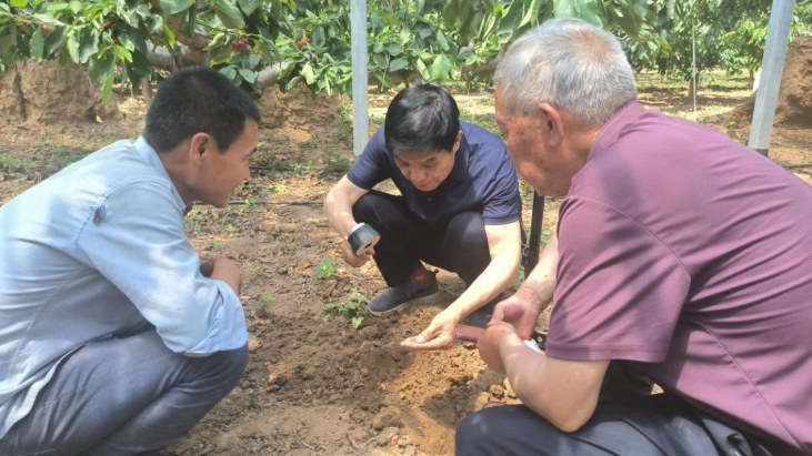 姬利军(左)、吕周锋(中)在果园里检测土壤。