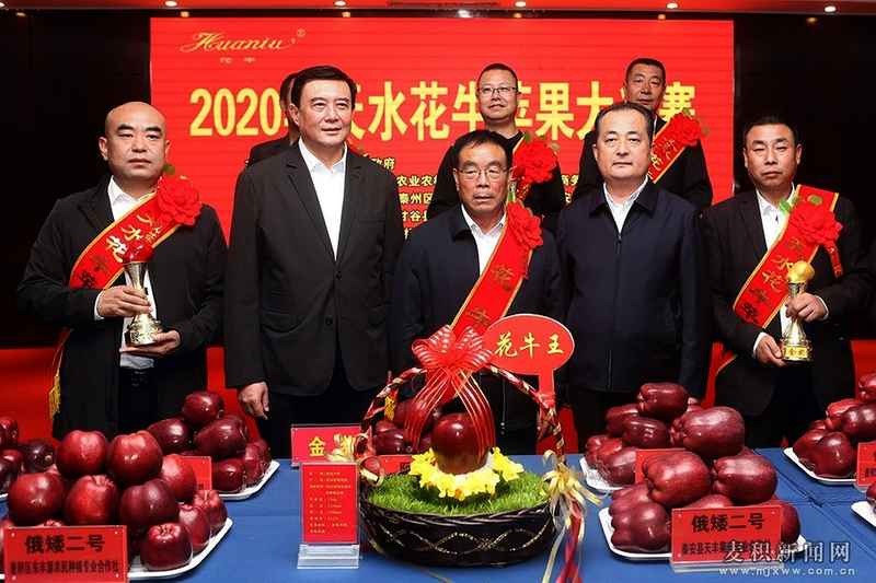 吴曙东(右一)代表合作社领取花牛苹果大奖赛奖杯。
