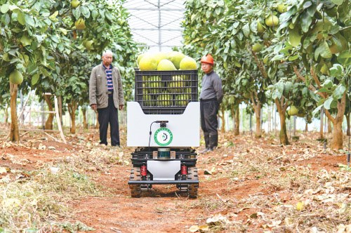 近日,由浙江省农业机械研究院自主研制的温室智能巡检搬运机器人正式投用。该机器人最大载重200公斤,爬坡角度超15度,能适应温室大棚狭窄地形和丘陵山地崎岖地况等多种环境。图为机器人在高低不平的田间平稳运行,搬运刚刚采摘的柚子。