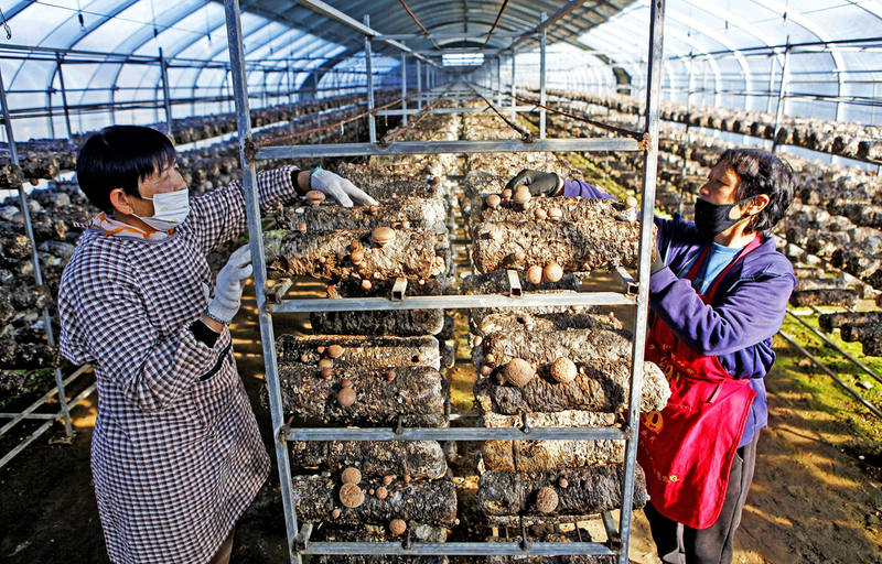 11月18日,山西省临汾市襄汾县邓庄镇邓庄村食用菌培植基地内,村民在大棚采收香菇。近日,该基地的14座大棚香菇陆续进入采收旺季,村民忙着开展采收、烘干、分拣、装筐等作业,大棚内外及加工车间一派忙碌景象。