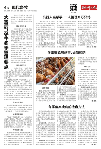 “这台机器人可24小时动态监测鸡舍温度、湿度等环境指标,同步观察鸡群健康状况,并支持远程可视化巡查。一旦发现异常,系统会实时反馈数据,帮助我们迅速科学应对。”12月5日,四川省广安市广安区石笋镇将军村蛋鸡养殖基地技术员罗鹏告诉笔者,依托智能化管理系统,一人可高效管理8万只鸡。
