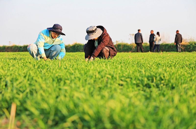 12月19日,在安徽省宿松县省属农垦华阳河农场第六农业分场,农科所农技人员开展小麦生育期调查工作。
