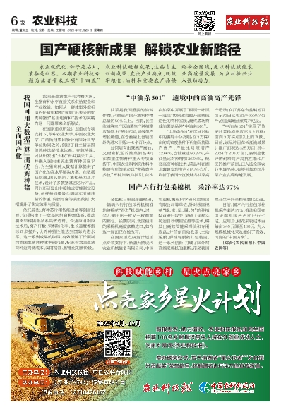 农业现代化,种子是芯片,装备是利器。本期农业科技专题为读者带来三项“十四五”农业科技硬核成果,这些自主创新成果,直击产业痛点,既筑牢粮食、油料和重要农产品供给安全防线,更以科技赋能农业高质量发展,为乡村振兴注入强劲动力。