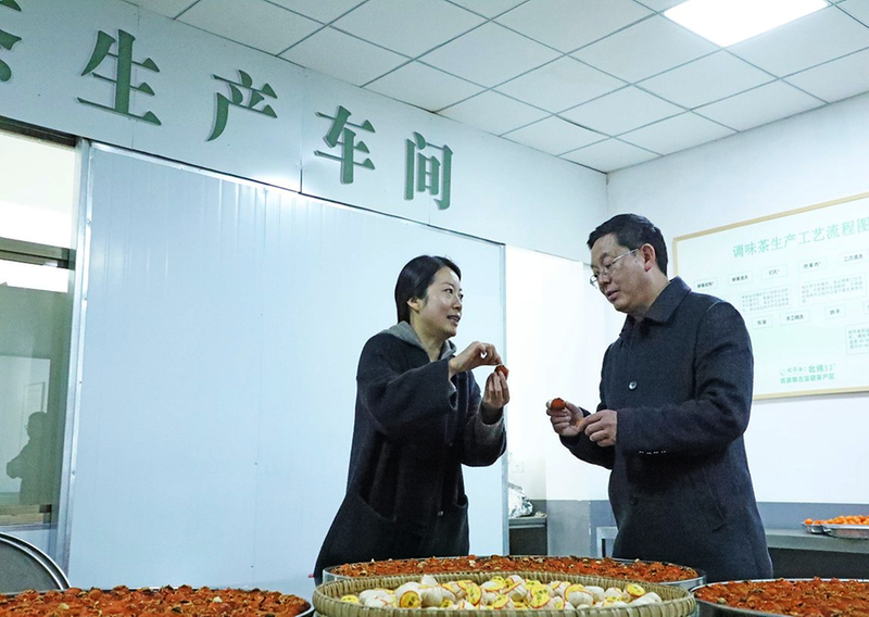 紫阳县旺源春茶业有限公司总经理朱富玲向紫阳县农业农村局三级调研员、党组成员方先念(右)介绍小橘茶的精制加工过程