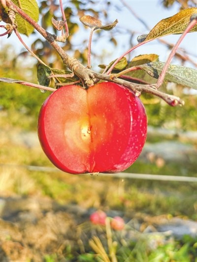 ▲“红丹”红肉苹果,甜酸适口。 近日,青岛农业大学苹果新品种“红丹”以200万元价格成功转让。