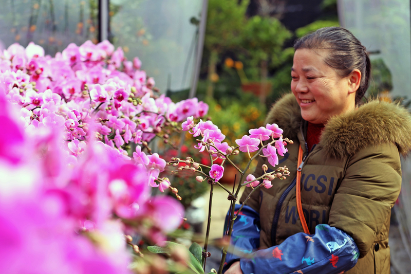 1月14日,四川省乐山市牟子镇花卉种植基地的大棚内,市民正在精心选购蝴蝶兰。